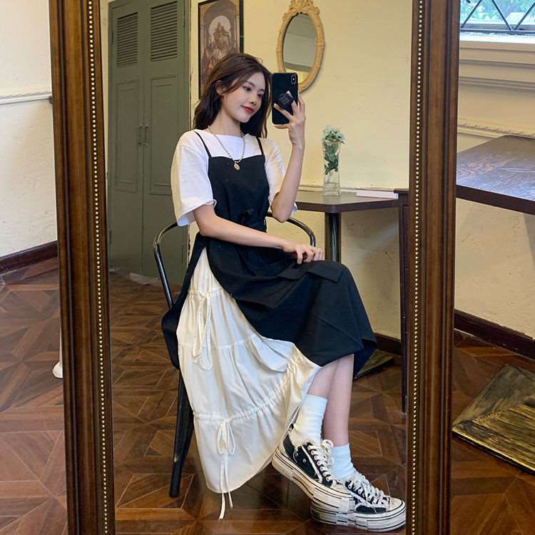 夏季韩版2021新款法式设计感假两件收腰显瘦中长款短袖连衣裙子女热门设计联盟服务商