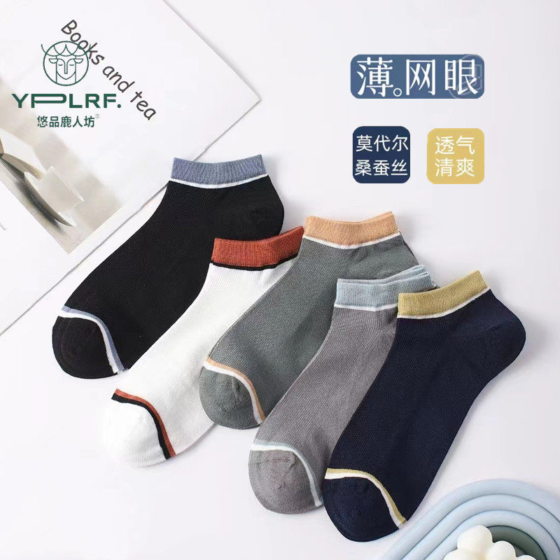 悠品鹿人袜子男夏季薄款短筒网眼船袜桑蚕丝抗菌防臭吸汗男士黑色热门设计联盟服务商