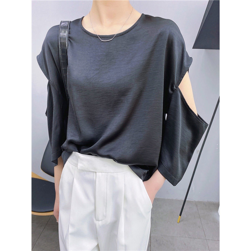 缎面黑色上衣女2021夏季新款设计感小众宽松显瘦时尚圆领露肩T恤热门设计联盟服务商